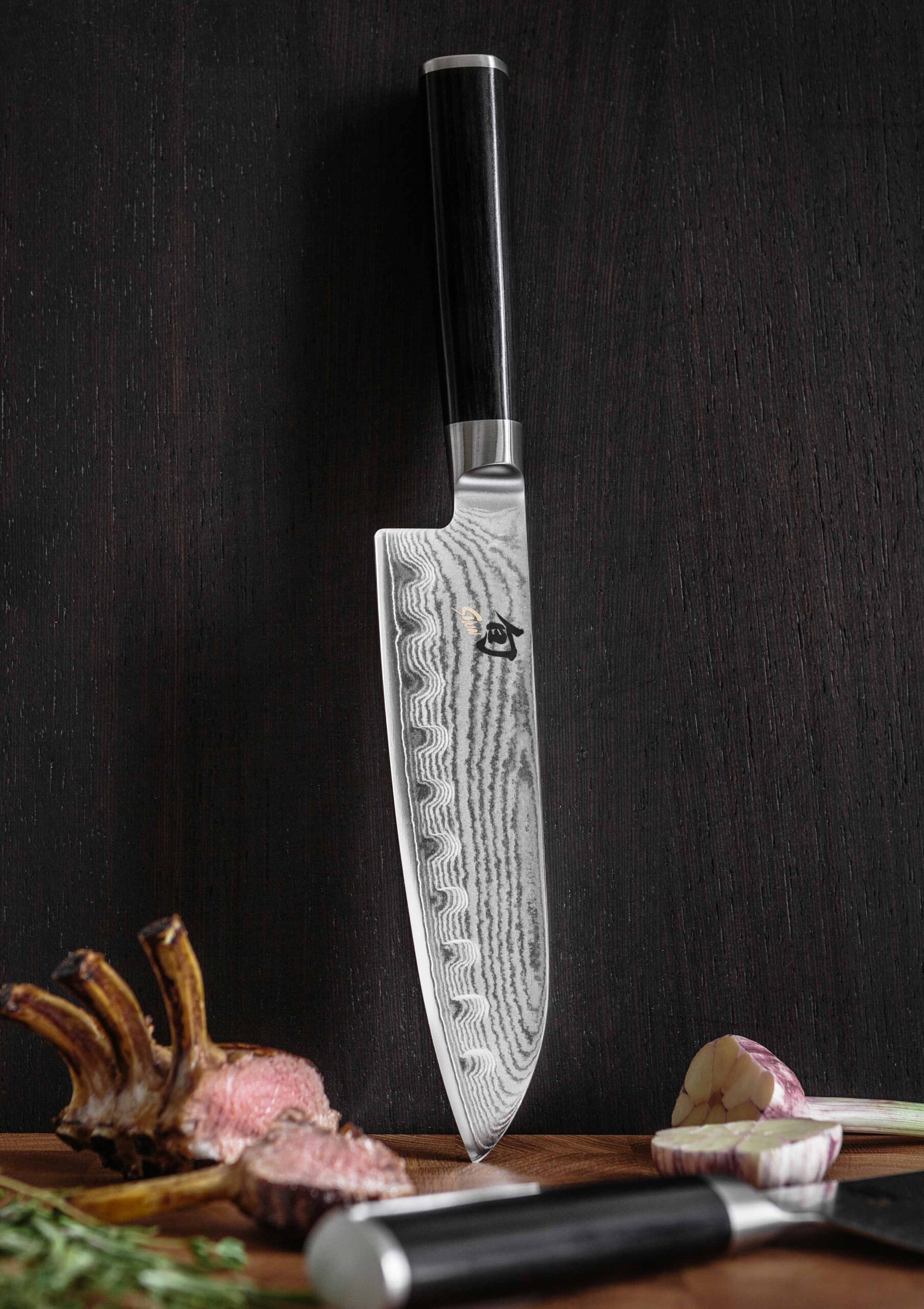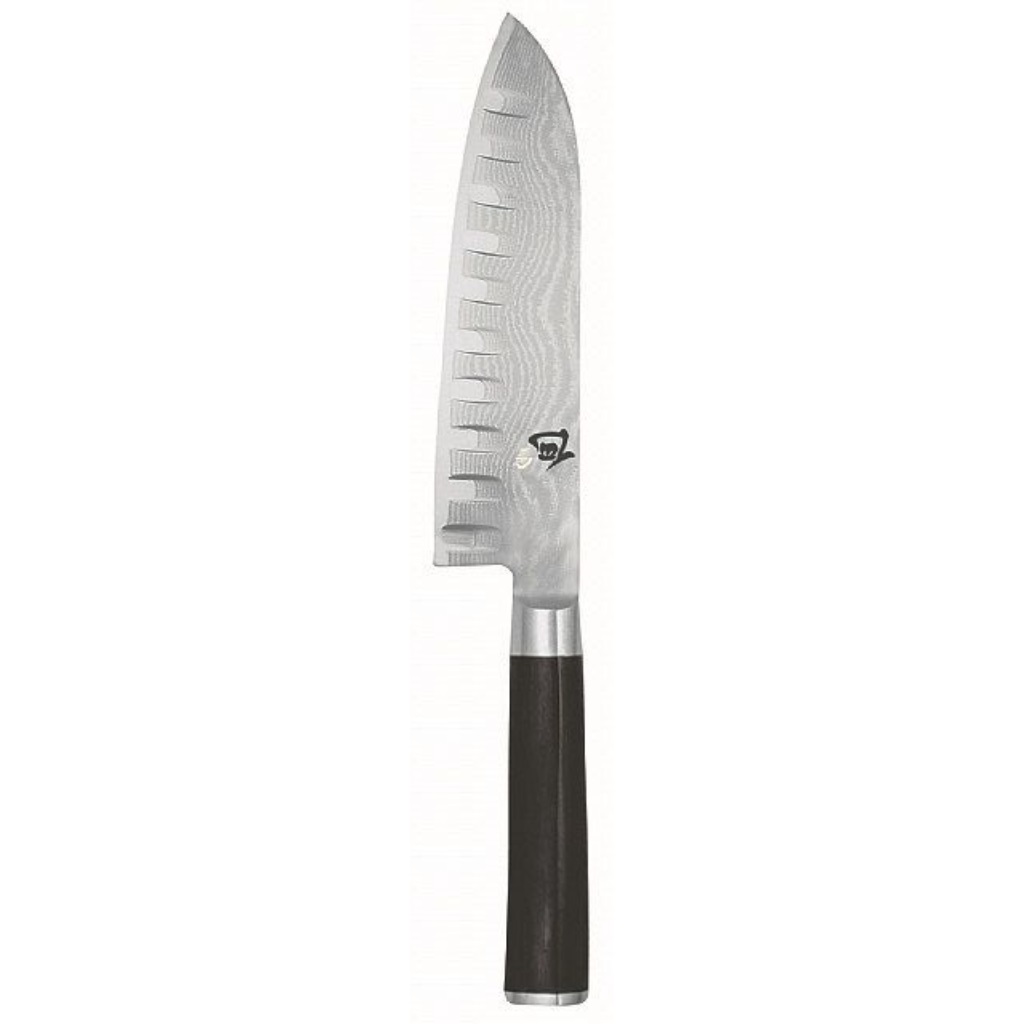 סכין סנטוקו Shun Classic עם להב 18 ס"מ מפלדת דמשק 32 שכבות וחריצים למניעת הידבקות. עיצוב יפני קלאסי וידית ארגונומית לעבודה נוחה ומדויקת. איכות מקצועית מבית KAI