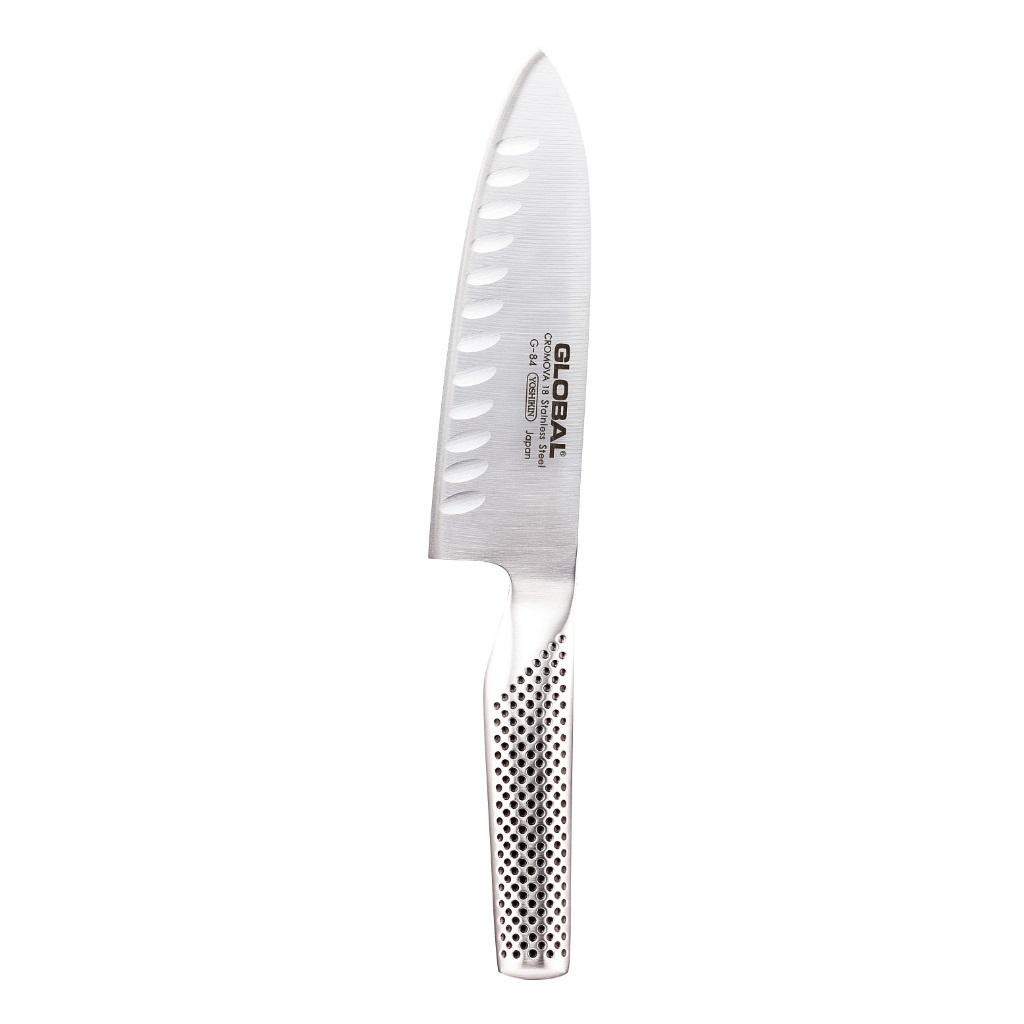 GLOBAL G-84 – סכין שף חריצים 16 ס"מ מפלדת CROMOVA 18 עם חריצים להפחתת הידבקות המזון. ידית ארגונומית מנירוסטה, איזון מושלם ונוחות בשימוש מקצועי וביתי.