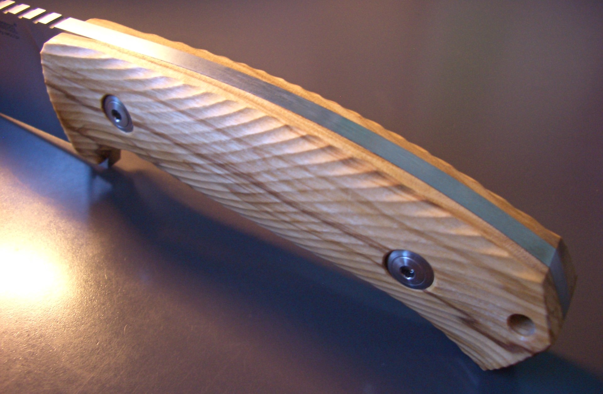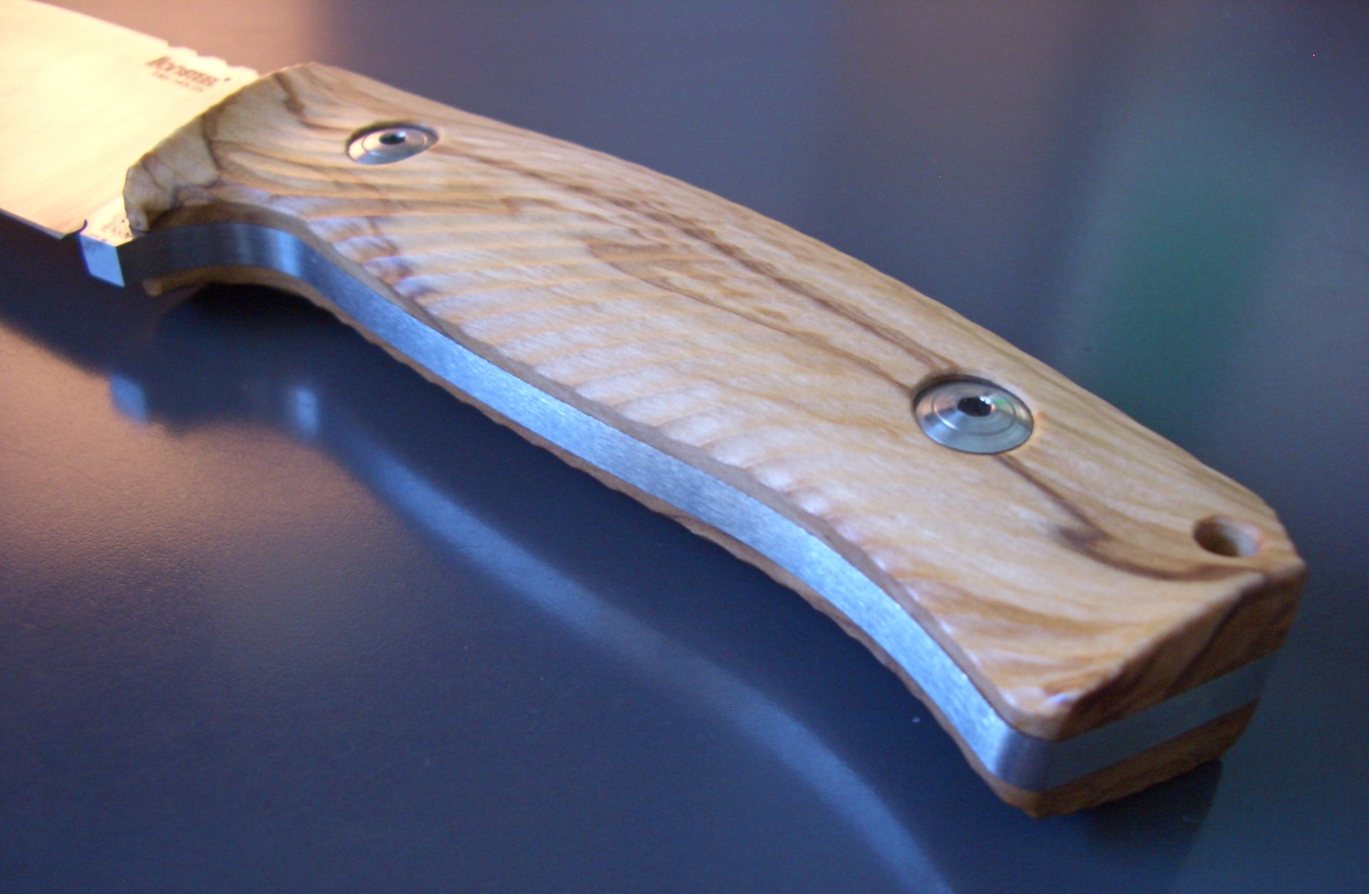 ידית הסכין מעוצבת בחריטה תלת-ממדית (3D machined) לתוצאה ארגונומית אופטימלית, כשהטקסטורה שעל פני השטח מספקת אחיזה יציבה ובטוחה במיוחד. הידית מקובעת באמצעות ברגי Torx T8 מנירוסטה.